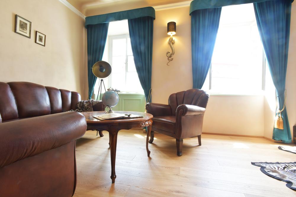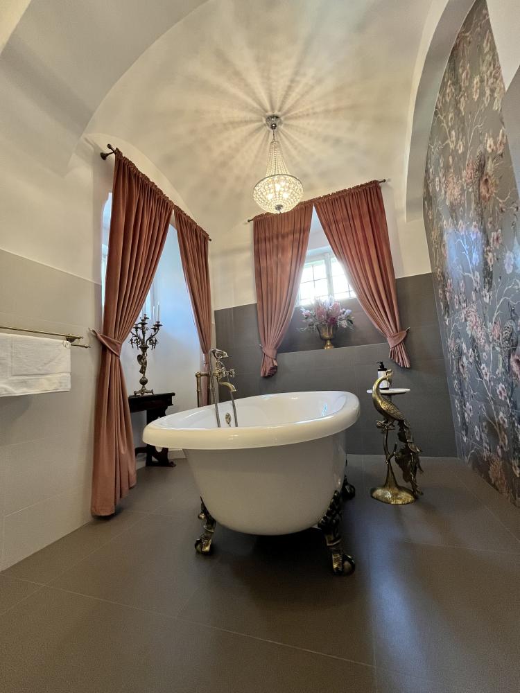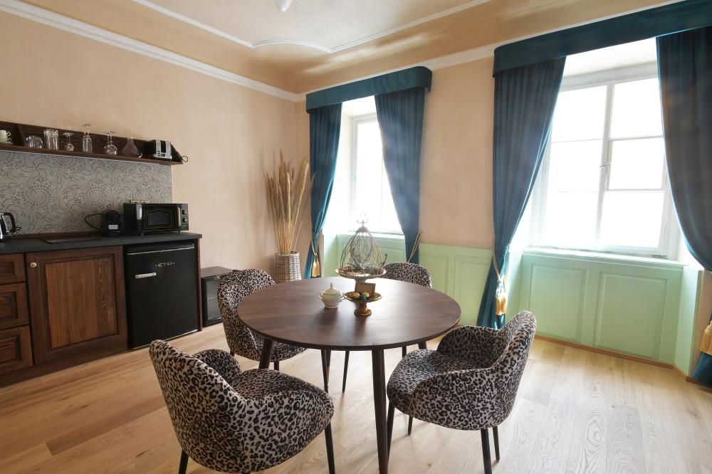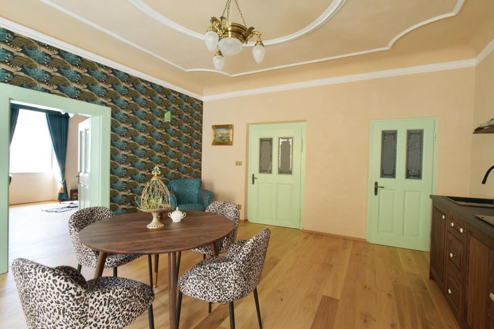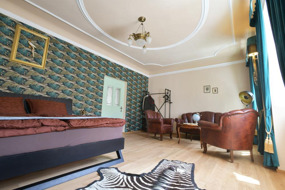 Elegantní apartmán ve stylu art deco s unikátními zvířecími motivy, který je inspirovaný tradičním „pánským pokojem“. Apartmán o rozloze 52 m² nabízí klidný výhled na nádvoří a je ideální pro páry nebo pracovní cesty. Tento exkluzivní prostor vám poskytne soukromí a komfort v klidné lokalitě v areálu zámku.Dispozice apartmánu: