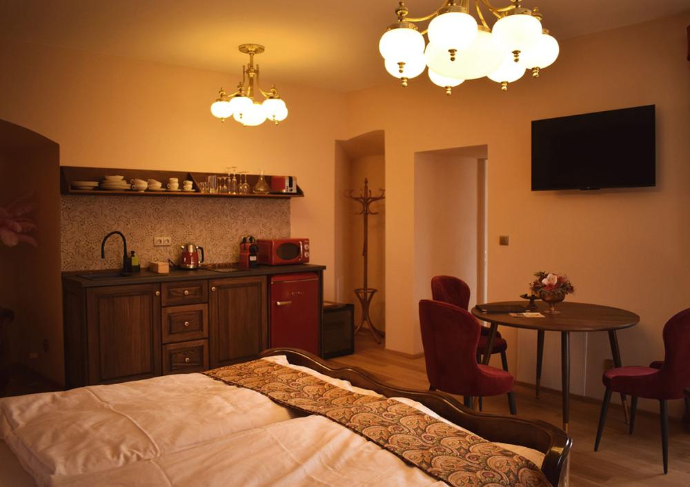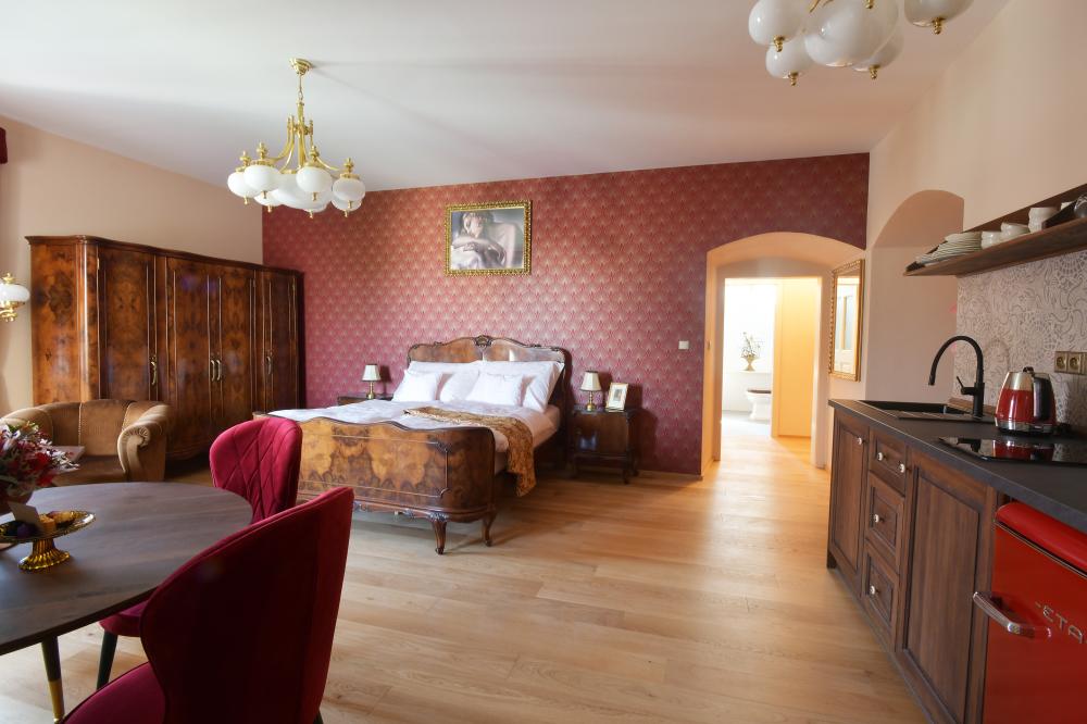 Luxusní apartmán ve stylu art deco, ideální pro novomanžele nebo páry hledající romantický pobyt. Tento jednopokojový apartmán o rozloze 33 m² je situován na západ, což zaručuje nádherný výhled na západy slunce a klidnou atmosféru. Dispozice apartmánu: